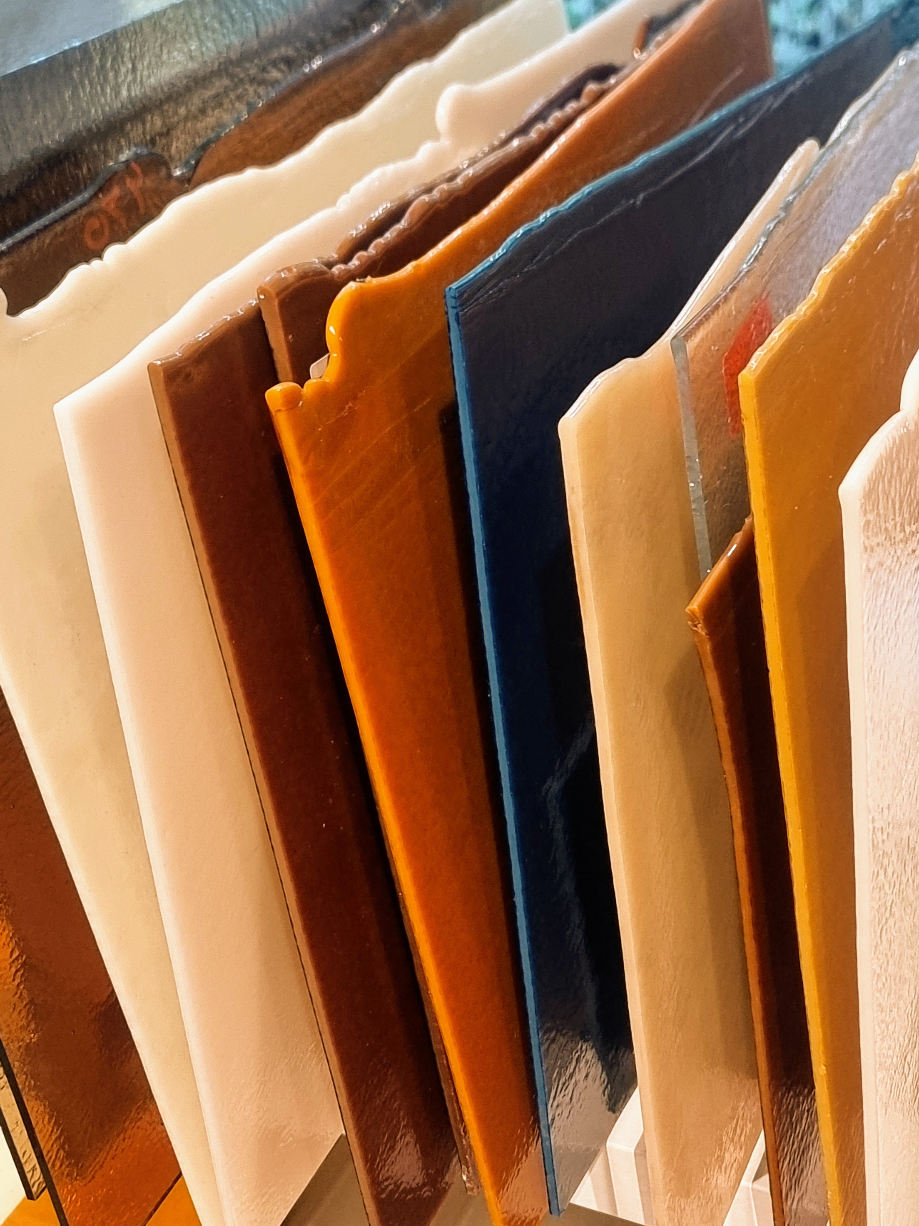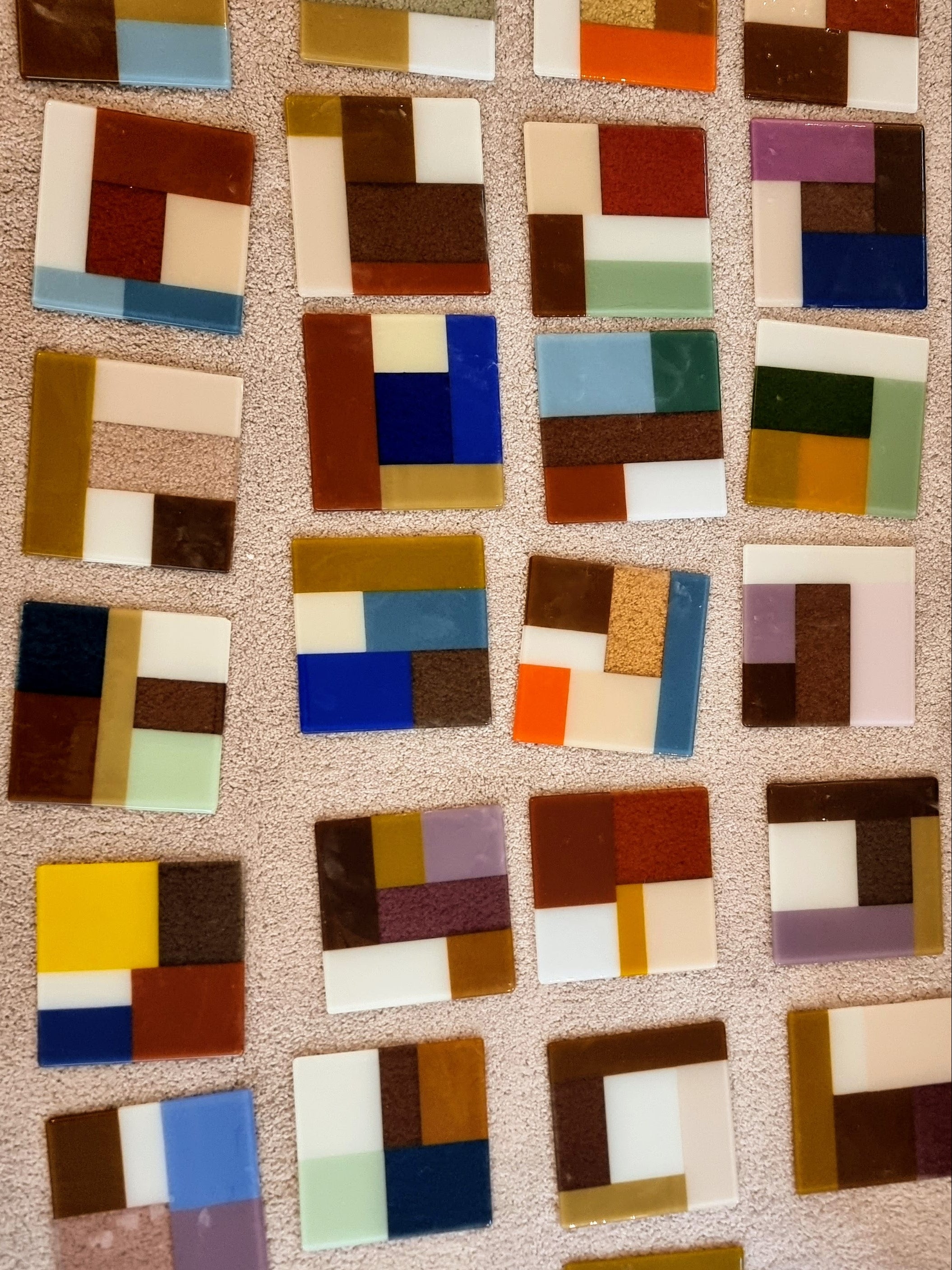 The items serve as thoughtful details that bring a burst of color to your home. The balance between the sharp lines of the squares and the soft, flowing edges of the glass creates a playful, lighthearted effect.
